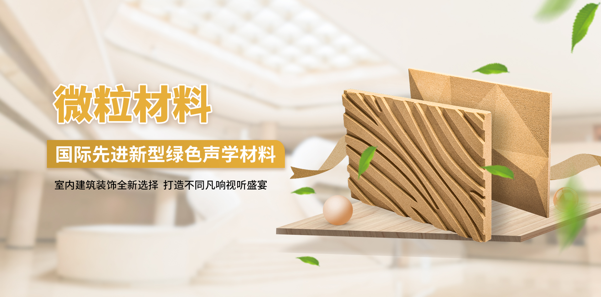微粒材料是一種新型綠色裝飾材料,具備優(yōu)異的聲學性和物理性能。該材料是以天然砂粒或經(jīng)環(huán)保處理的固廢顆粒為骨料,以環(huán)保膠凝劑,通過壓振工藝,生產(chǎn)的具有大量相互連通的微小空隙的多孔材料。